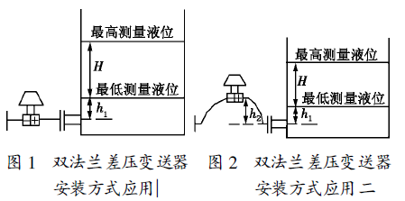 1) 雙法蘭差壓午夜成人福利片安裝在開口容器低端法蘭水平線上, 且高低壓室法蘭與容器低端法蘭在一條水平線上。如圖1所示, 高壓室法蘭與容器低端法蘭相連接, 並且高壓室法蘭、低壓室法蘭與容器低端法蘭在一條水平線上。