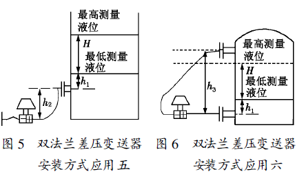 3) 雙法蘭差壓午夜成人福利片安裝在開口容器低端法蘭水平線以上, 且低壓室法蘭與容器低端法蘭不在一條水平線上, 如圖3 所示。雙法蘭差壓午夜成人福利片安裝在開口容器低端法蘭水平線以上, 高壓室法蘭與容器低端法蘭相連接, 低壓室法蘭與容器低端法蘭不在一條水平線上。