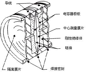 被測介質的兩種壓力通入高、低兩壓力室,作用在δ元件(即敏感元件)的兩隔離膜片上,通過隔離膜片和δ元件內的填充液傳送到預張緊的測量膜片兩側。測量膜片與兩側絕緣體上的電極各組成一個電容器,在無壓力通入或兩側壓力均等時測量膜片處於中間位置,兩側兩電容器的電容量相等。當兩側壓力不一致時,致使測量膜片產生位移,其位移量和壓力差成正比,故兩側電容量就不等,通過檢測此電容極板上的差動電容,再由電子線路把差動電容轉換放大成4-20mADC的二線製電流信號。