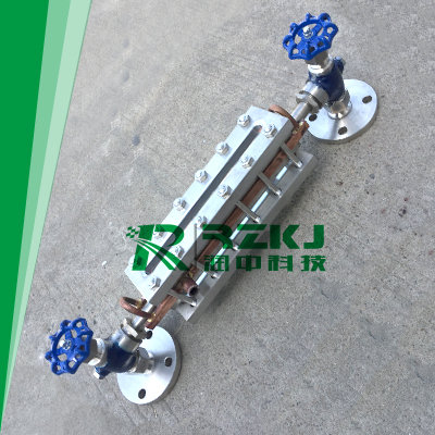 儀表的上下閥上裝有法蘭接頭,與容器連接構聯通器,透過玻璃板直接指示容器布什的液位,“夾套型”設有加熱或冷卻裝置。該裝置加熱時可用蒸氣,冷卻時可用循環水,這樣可以調節流動性能,夾套型接管尺寸ZG1/4內螺紋。在上下閥內裝有鋼球,當玻璃板因意外事故破壞時,鋼球在容器壓力作用下,自動密封,防止容器內的液體繼續外流。在儀表的上端針形閥裝有阻塞螺釘,可供放氣之用,下端針形閥也裝有阻塞螺釘。可供放空、取樣、排汙、清洗。